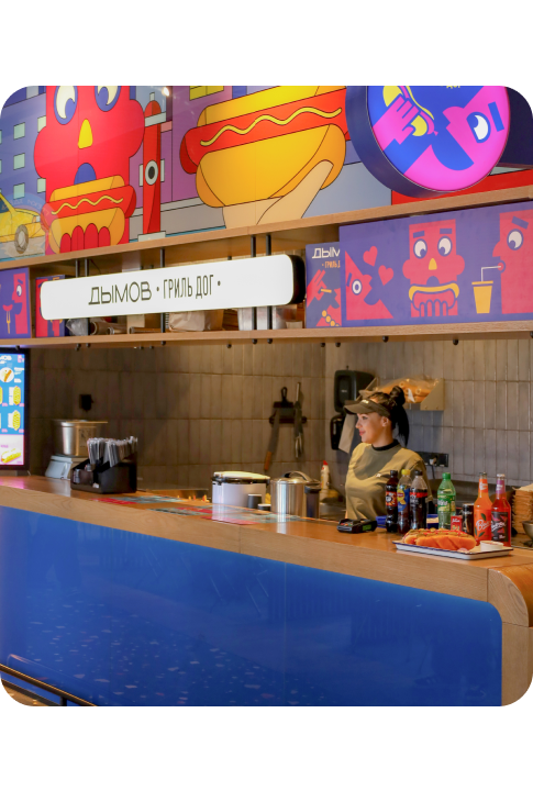 87% — индекс лояльности к бренду Дымов. Нашу вывеску узнают на фудкортах, парках и фестивалях. Знакомый для потребителя бренд вместе с ярким и современным дизайном создают атмосферу уюта и гостеприимства у гостей.